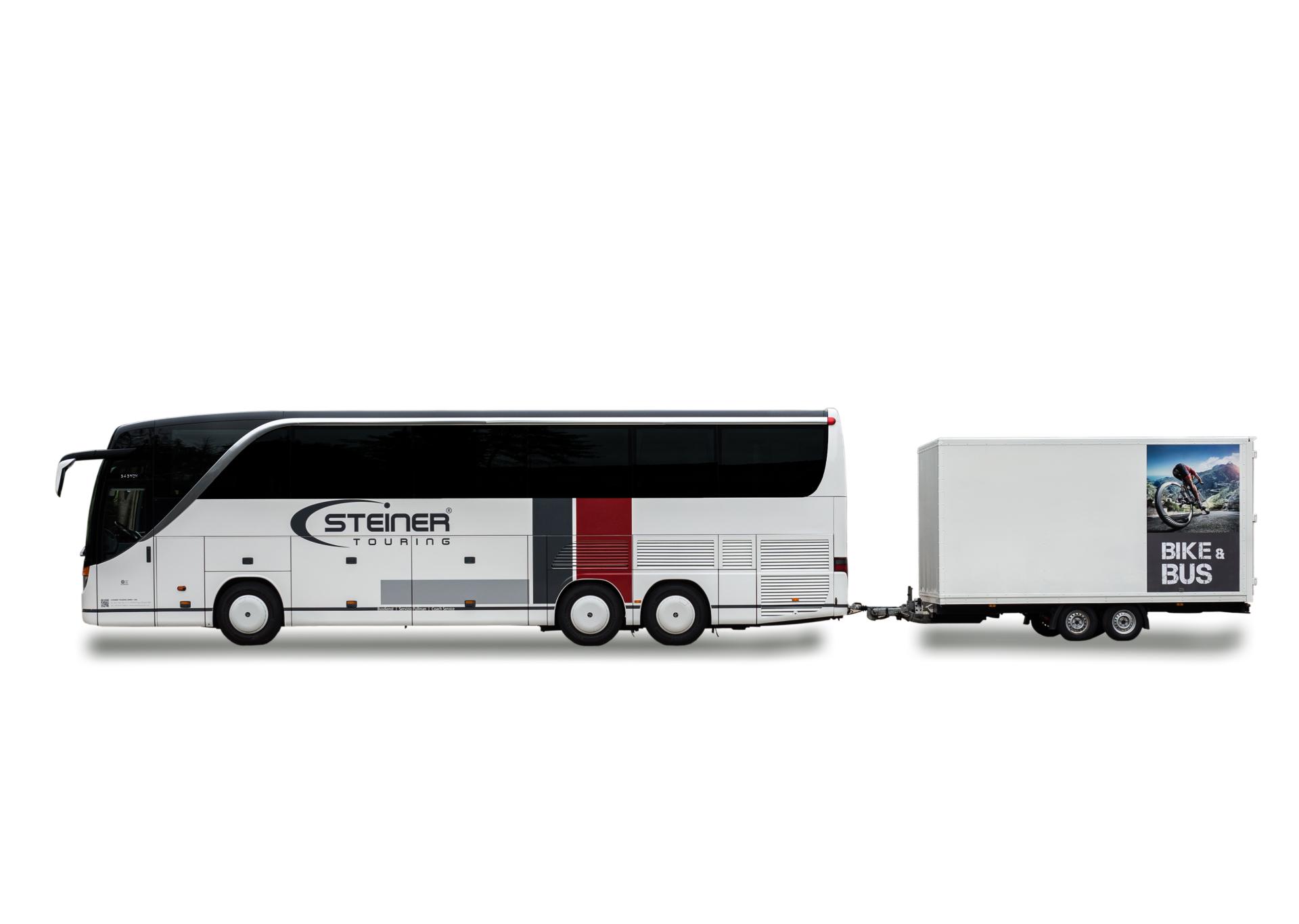 Reisebus Setra mit 52 Sitzplätzen und Radanhänger für bis zu 38 Fahrräder.